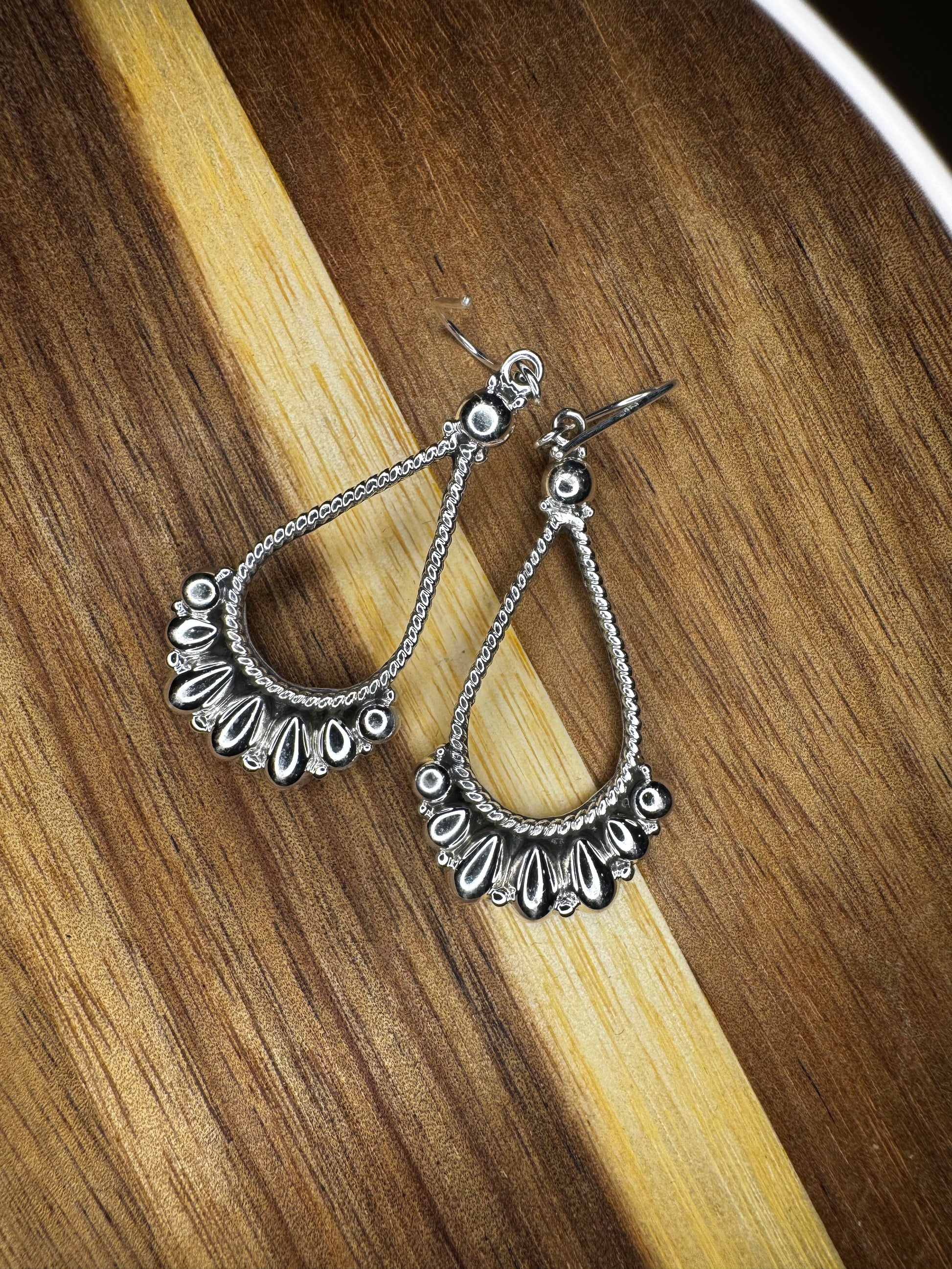 These elegant sterling silver hoop earrings feature delicate dangling leaf accents that add movement, texture, and a subtle Southwestern-inspired touch. The open hoop design keeps them lightweight and comfortable, while the fringe detail creates a soft statement that catches the light with every turn.